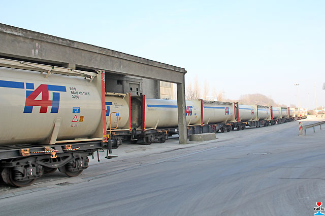 Chargement des 10 premiers wagons du premier train de ciment conditionné en conteneurs-citerne Esch/Alzette - Lyon, en-dessous du silo No 15 à la Cimenterie à Esch/Alzette, avec la loco CFL cargo 1503, remplacée par la CFL cargo 1501 au cours de la matinée (Photos: 5.3.2011 jmo)