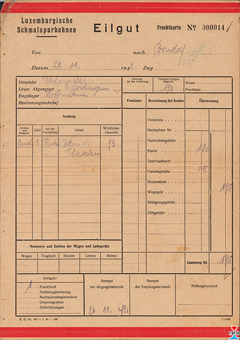 Luxemburgische Schmalspurbahnen - Frachtkarte N° 14 Eilgut 20.11.1942 Zug von Nördingen nach Bondorf (Collection: jmo)