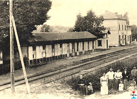 Clemency - L'ancienne gare (à la gauche le Bâtiment de la douane - à la droite le Bâtiment des recettes) et la nouvelle gare, vers 1903 (Détails