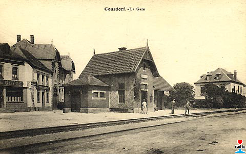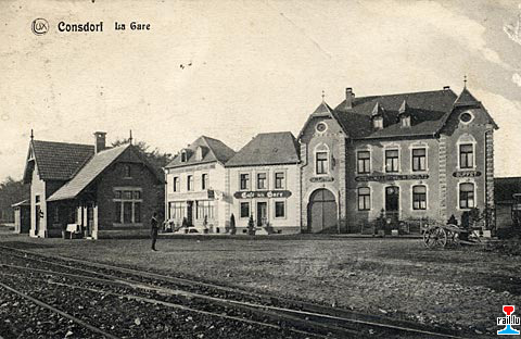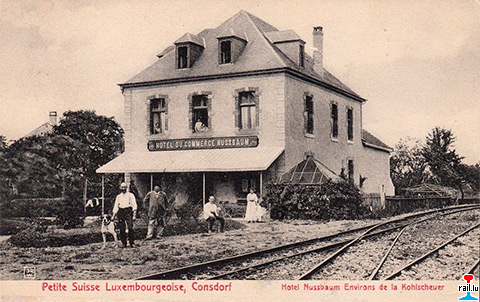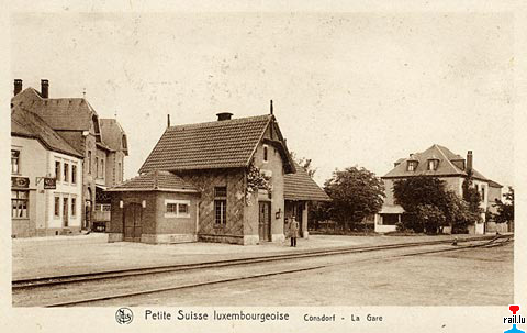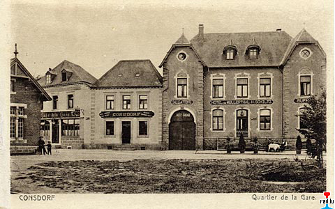 La gare Consdorf -à la droite l'Hôtel du Commerce (Carte