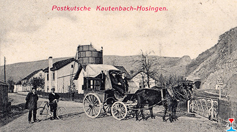 - Die Postkutsche Kautenbach - Hosingen beim Bahnübergang 35a in Kautenbach - Blick Richtung Norden - rechts vom Tunnel das Gleis das Gleis zur Drehscheibe (Carte postale Poststempel: 9.8.1912; Collection: Robert Wagener)