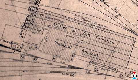 Atelier du Petit Entretien - Palan électrique - Magasin à bois - Réservoir à Air comprimé - Matériel Roulant - fosse à vérins (Plan 1986 collection jmo)