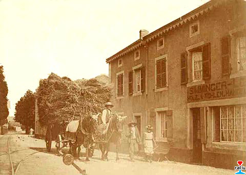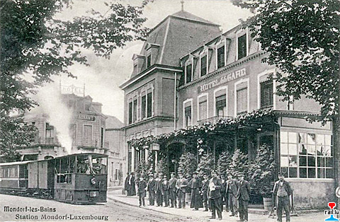 Mondorf-les-Bains - Station Mondorf Luxembourg - tram à vapeur devant Hôtel de la Gare, vers 1913 (Carte postale)