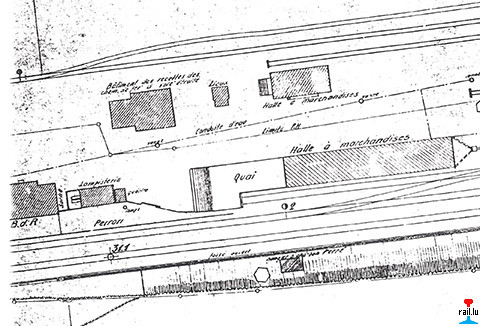BdR - bâtiment des recettes des chemins de fer à voie normale à Noerdange, lampisterie, guérite, lampe, perron, quai, halle à marchandises, bascule, grue hydraulique, guérie, réservoir d'eau, réservoir à goudron (Collection: Marcel Schlim)