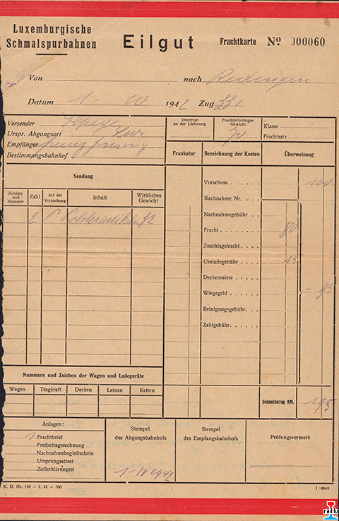 Luxemburgische Schmalspurbahnen - Frachtkarte N° 60 Eilgut 1.10.1942 Zug 331 von Nördingen nach Redingen (Collection: jmo)