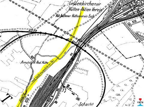 Schlackenbahn der Gelsenkirchener Bergw. A.G.- Deutsch-Oth - noch nicht ausgeführter Teil in Richtung Esch/Alzette (Übersichtskarte des Erzgebietes bei Deutsch-Oth, Esch und Villerupt - Kaiserliche Eisenbahn-Generaldirektion, Strassburg - 2.1910)