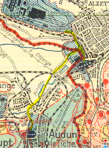 Embranchement de l'arrivée du funiculaire / silo "tour" de la Houtte (en jaune au milieu) sur la voie privée des hauts-fourneaux d'Audun (avec prolongement à Esch) - Carte de 1953 (Source: ign.fr)
