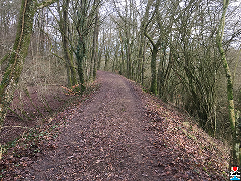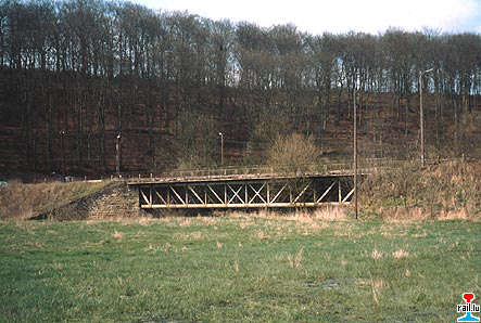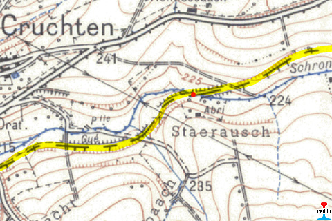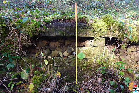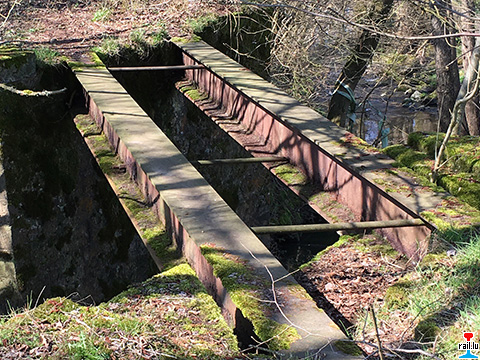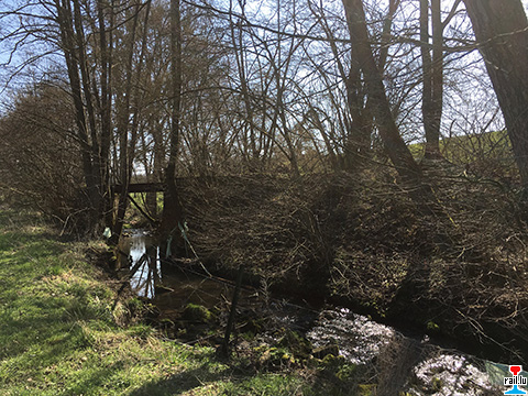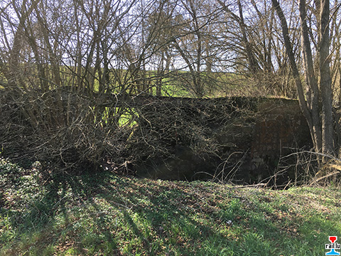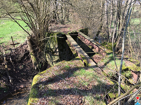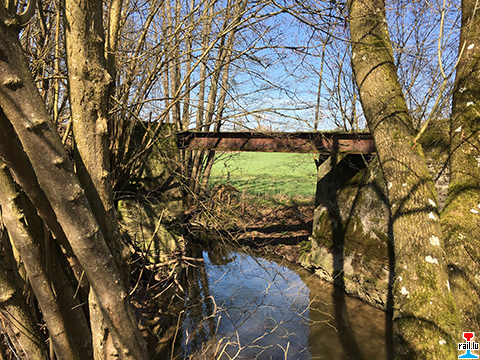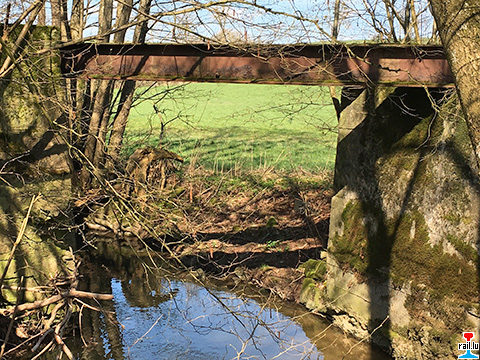 Iwwerreschter vun der Bréck vum Fielsser Jhangeli, am Dall tëschent Kruuchten an Schrondweiler. D'Bréck ass relativ gutt erhalen an zur Säit vu Kruuchten läit och nach +/- 100 m Bunndamm, den awer stark mat Beem a Straicher zougewuess ass (Photos: 2019 Edwin Kuiper)