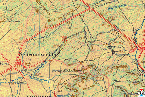 Bréck vum Fielsser Jhangeli (roude Punkt), am Dall tëschent Kruuchten an Schrondweiler.©  Origine Administration du Cadastre et de la Topographie Luxembourg (ACT) - Extrait de la carte topographique à l'échelle 1: 25.000 édition 1954 - Autorisation de publication du 20.10.2010.»