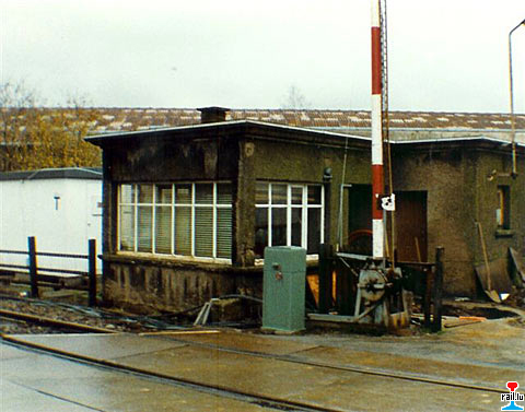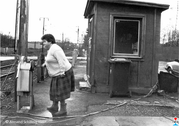 PN 4 Belval, abgebaut 1989 und durch eine Unterführung ersetzt, welche unter der neuen Haltestelle Belval-Lycée hindurchführt. Die Bahnschranke PN 4 auf der Strecke Esch-Petingen war damals die einzige noch handbediente Bahnschranke auf der freien Strecke. (Photo: 1987 Armand Schilling)