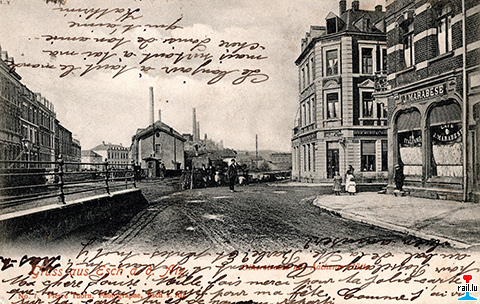 Esch/Alzette: Otherstrasse mit Aachener Hütte - Café Marabese - PN 1 vun der Eisebunnsstreck Esch - Péiteng - vers 1903 (Carte postale: No 7 Pierre Thorn, photographe, Esch/Alzette; collection: Marcel Schlim)