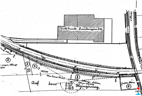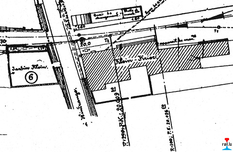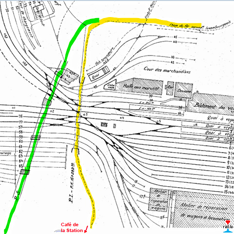 1928: lénks (gring): P.S. = passage supérieur = nei Betons - Bowstring - Bréck (ab 1929 a Betrieb) - riets (giel): P.I. = passage inférieur = "Knachenmillen"