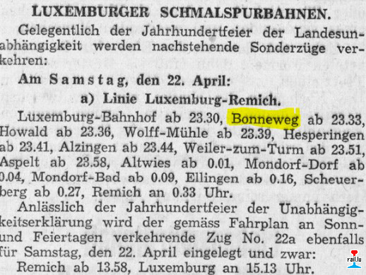 Halt Bonneweg - Fahrplang der Sonderzüge der " Jangeli" - Linie Luxemburg - Remich gelegentlich der Jahrhundertfeier der Landesunabhängigkeit vom 22.4.1939 (t: 19.4.1939)
