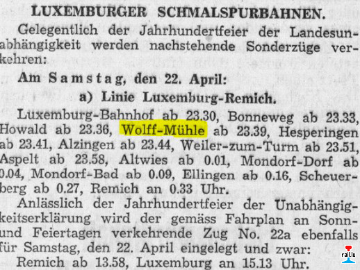 Halt Wolff-Mühle - Fahrplang der Sonderzüge der "Jangeli" - Linie Luxemburg - Remich gelegentlich der Jahrhundertfeier der Landesunabhängigkeit vom 22.4.1939 (t: 19.4.1939)