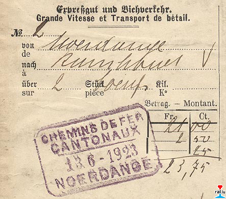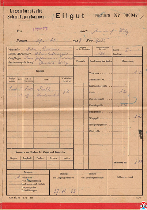 Luxemburgische Schmalspurbahnen - Frachtkarte Eilgut 27.11.1942 Zug 4025 von Nördingen nach Bondorf - Holz (Collection: