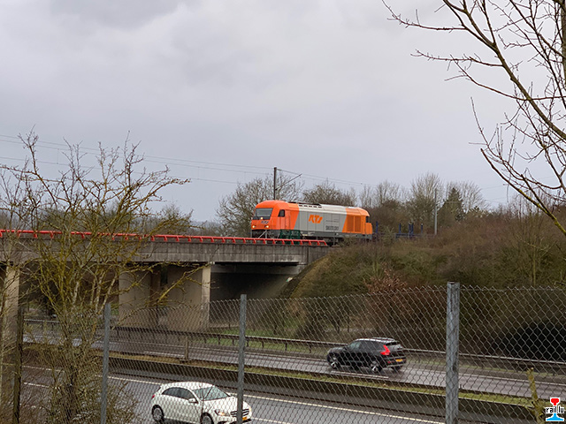 Wéinst Aarbechten un der Autobunnsbréck vun der A13 zu Schëffleng - D'DE 18 305 op der Velosbréck iwwer d’Autobunn bei Näerzeng fotograféiert (Photos: 10.9.2021 René Birgen)