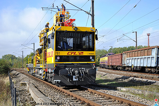 CFL Robel Steuerwagen 781 bei Oberleitungsarbeiten auf der Strecke Rodange - Longwy und CFL Cargo 1815 mit Güterzug von Bettemburg nach Athus auf der Strecke Rodange - Athus (Foto: 28.9.2012 Mike Wohl)