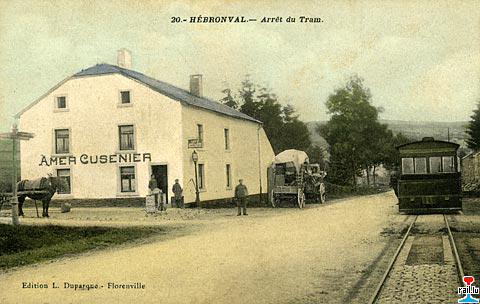 Arrêt du Tram (vicinal) à Hébronval (Bihain) - Café (Amer Cusenier) (Carte postale: Edition L. Duparque - Florenville; collection jmo)