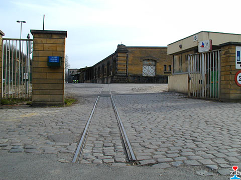 Ehemalige Bäckerei der Kaserne Steinmetz in Metz, Boulevard de Trèves - Teile des früheren 600 mm - Feldbahngleises sind noch 2003 im Pflaster erhalten.