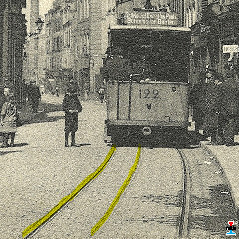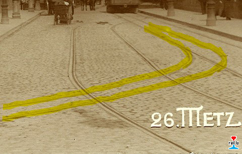 5. Il y avait également des voies dans le quartier de la rue Châtillon, du Rempart St-Thiébeau (Rempart Serpenoise) et de la place Saint-Thiébault. Comment étaient-elles reliées aux autres lignes ? La voie devait traverser la ligne de tramway. Il existe de nombreuses cartes postales de la zone Römerallee (avenue Serpenoise) - Römerstraße (rue Serpenoise), mais on n'y voit nulle part de voie de 600 mm !
