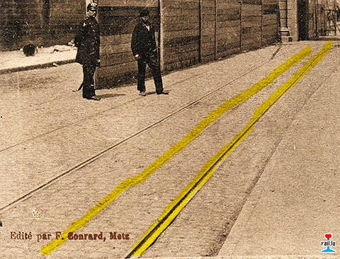 Metz - Fort Moselle - rue de Paris - voie à deux écartements - voie à 3 rails - 3 Schienengleis: Tramways 1435 mm + 600 mm <=1912 (AK Sammlung Richard Lutz)