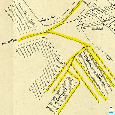 Cet extrait du plan de 1906 provenant des archives municipales de Metz montre les voies dans la zone de la Porte de France (Franz. Tor), Caserne de l'infanterie,