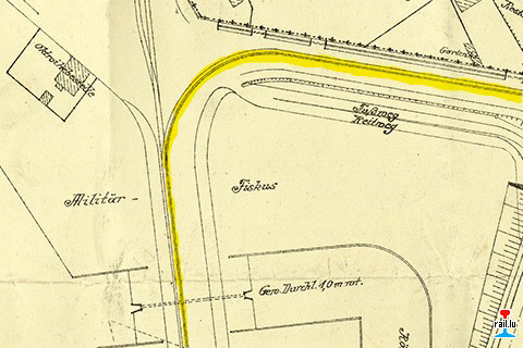 Dieser Ausschnitt des Planes von 1906 aus dem Stadtarchiv Metz, zeigt die Gleise im Bereich Bahnhof Devant-les-Ponts vor der Umgestaltung mit der Eisenbrücke (Pont de Fer). Oktroi-Hebestelle