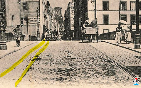 1. Die 60 cm - Militärbahn in Metz führte vom Bahnhof Devant-les-Ponts über Totenbrücke (Pont des Morts) und Mittelbrücke (Moyen-Pont), zweigte rechts in die Wachtstraße (rue de la Garde) ab, dann gleich wieder links zum Bezirkskommando und Justizpalast (Palais de Justice).