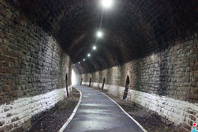 Tunnel Lommersweiler - Am Tunnel zu Lommersweiler, dee Richtung St.Vith lait an 1888 gebaut gouf, gouf eng LED-Belichtung installéiert, déi mat engem Capteur ugeet esoubaal en Mënsch an de Wënkel vum Capteur kënnt Et ass e Genoss wann een eng LED-Belichtung an engem 126 Joër aalen Tunnel gesait. (Photos: 30.11.2014 Dan Antony)