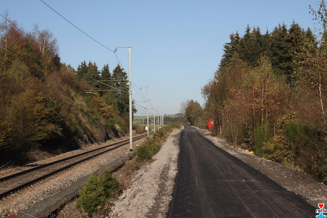 Dans le cadre d'un projet européen, les travaux d'aménagement d'une piste cyclable sur l'ancienne Vennbahn sont en cours. Entre Wilwerdange et Troisvierges la couche asphaltée vient d'être posée. Comme le tunnel de Troisvierges ne peut pas être traversé (voie électrifiée Troisvierges-Gouvy passant par le milieu), la colline en question est surmontée par un nouvelle piste asphaltée en lacets. Le passage du tunnel de Wilwerdange, site unique d'hivernation pour 7 espèces de chauves-souris, présente un autre impact important sur l'environnement. Photo: 23.10.2011 / peu avant le tunnel de Troisvierges / Nico Mercatoris