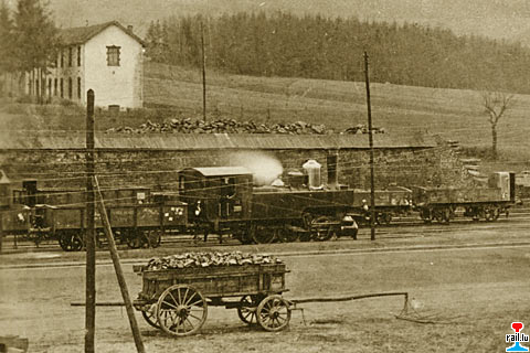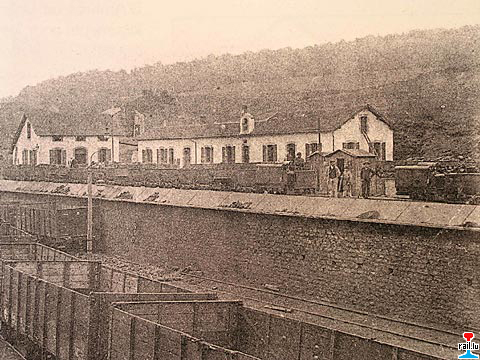 Förderbahn mit Seilbetrieb (geneigte Ebene) - Ladestelle Brucherberg der Société luxembourgeoise des mines de fer à Luxembourg - Stall - um 1890 (Collection: Marcel Schlim)