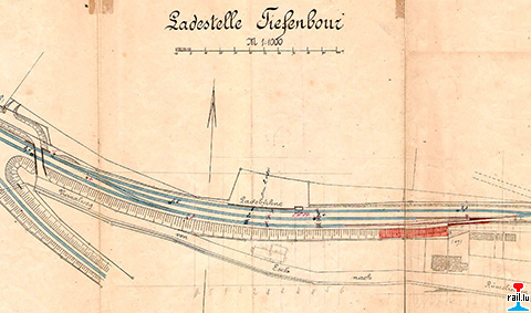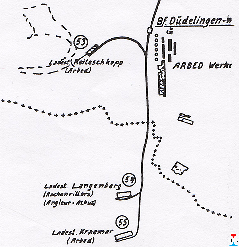Quai - Ladestelle N° 39:   Tiefenbour, Rumelange - rechts die Rümelinger Hütte (Hadir) (Plan der Liefergemeinschaft der luxemburgischen Eisenerzgruben: 16.11.1940 collection: jmo)