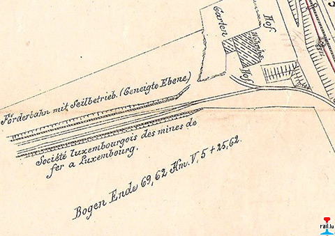 Links die Ladebühne (Quai) und Seilebene (Plan incliné) der Grube Lallingerberg (Cockerill) der Gebrüder Servais & Cie, rechts die  Ladebühne  (Quai) und Seilebene (Plan incliné)  der Grube Lallingerberg von Metz & Cie, unten (in weiss) die Anschlussgleise der Metz-Hütte in Esch/Schifflange (Plan: 7.9.1873 Salentiny)