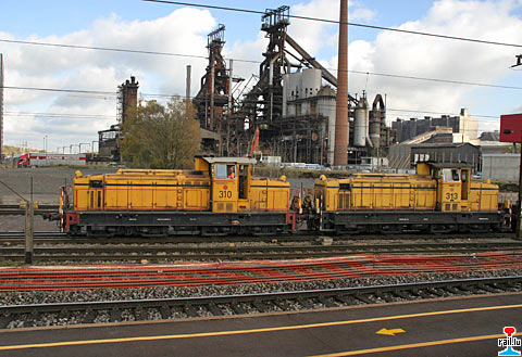 Locomotives Profil-ARBED 310 et 313 à Belval-Usines avec au fond les hauts-fourneaux A et B d' Arbed-Belval (Photos: 9.11.2006 jmo)