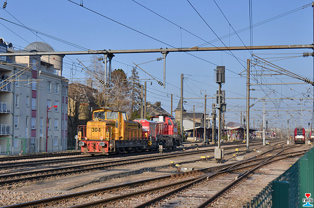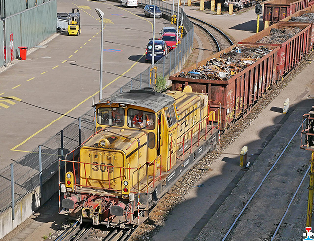 Wegen einer Entgleisung in Belval, wurde am 2.4. ein mit Schrott beladener Güterzug, und Flachwagen in Differdingen über das frühere Anschlussgleis ins Werk Differdingen gebracht. Auf den Bildern erkennt man die 308 auf dem Viadukt, sowie die 308 an einem Güterzug mit Flachwagen im Bahnhof Differdingen (Photos: 2.4.2007 Dan Antony)