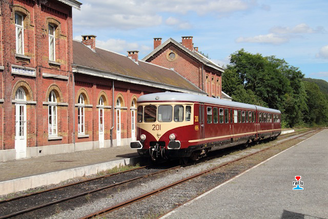 27.08.2012. Circulations avec l'autorail Westwaggon ex-CFL 201/211 entre Mariembourg et Treignes (Chemin de fer à vapeur des trois vallées). L'autorail attend en gare de Treignes le retour vers Mariembourg. Photo: Mercatoris Nico