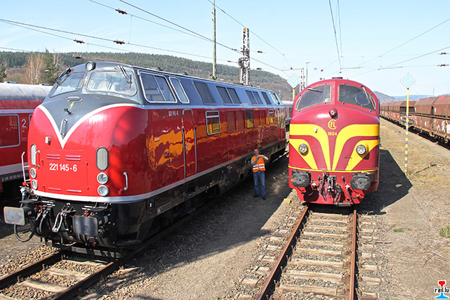 Haut am Noometten sin d'1604 an d'Remorque Decauville vun hierer HU vun Neustrelitz zerëck op Lëtzebuerg iwerfouert gin. D'Lok 1587 vun der CFL Cargo huet den Transfert zwëschen Ehrang an Péiteng gemaach. D' 221 145 vun der Prignitzer Eisenbahn ass vun Neustrelitz aus gefuer. (Photo: 9.4.2015 Christian Schmitz)