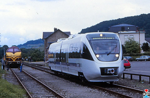 Dieseltriebwagen Talent auf Sonderfahrt in Colmar-Usines, links die CFL Diesellok 1801 (Photo: 23.6.1996 René Birgen)