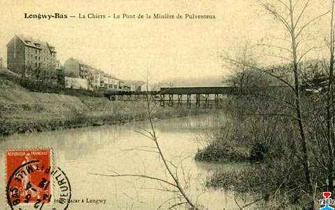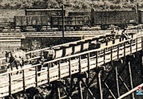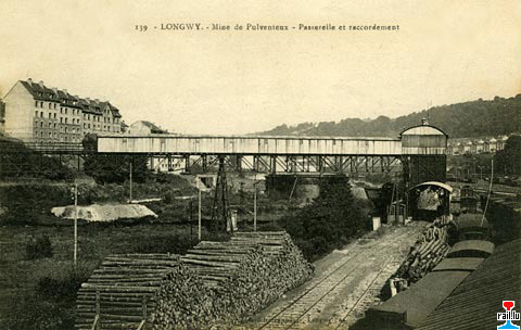 L'ancienne passerelle en bois partiellement couverte de la Mine de Pulventeux, vers 1912 (Carte
